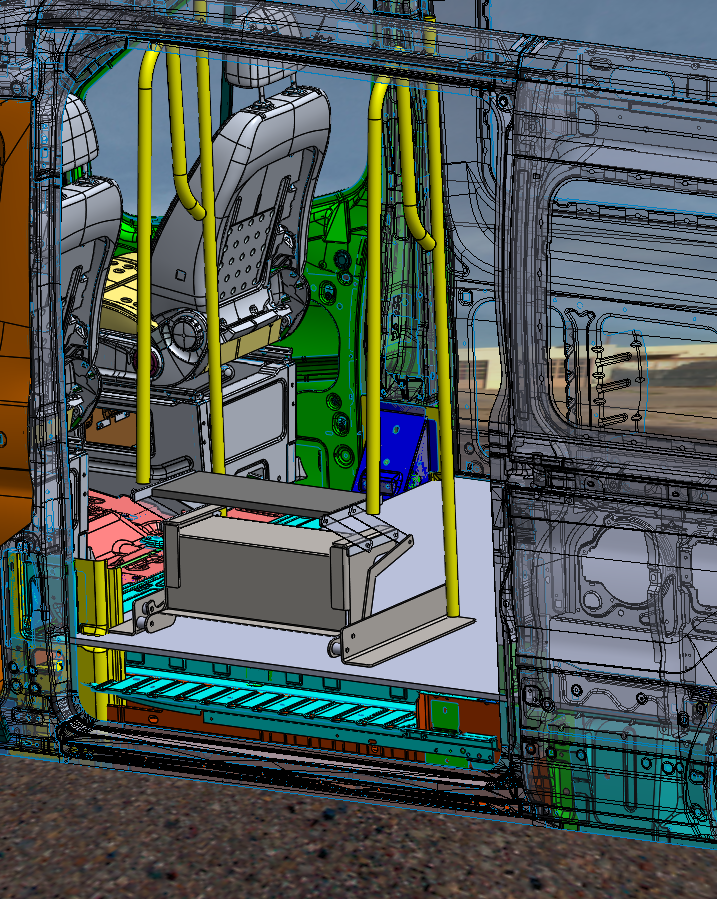 Mercedes CAD model drawing which is being used to design a change table for a client. Our Design Engineer is able to mark out the location of the change table after having worked out the desired measurements, and where to mount to the floor with ease of manufacturing in mind.