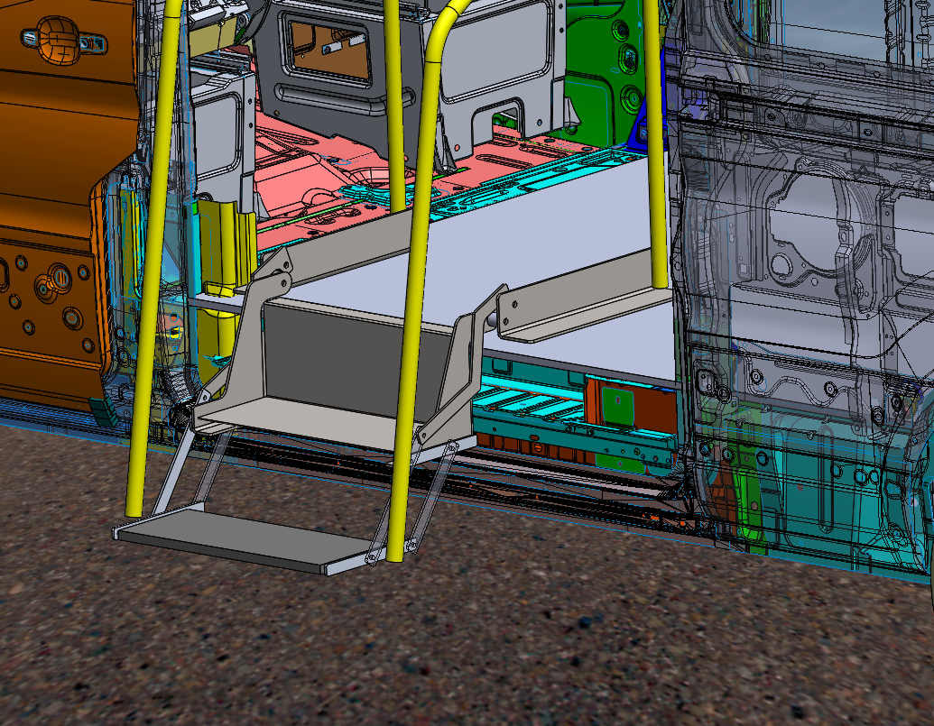 We are developing a prototype side-step with twin fold-out grab handles. This design provides access to the vehicle’s side door through a twin fold-out step, supported by two handles to assist occupants as they enter.